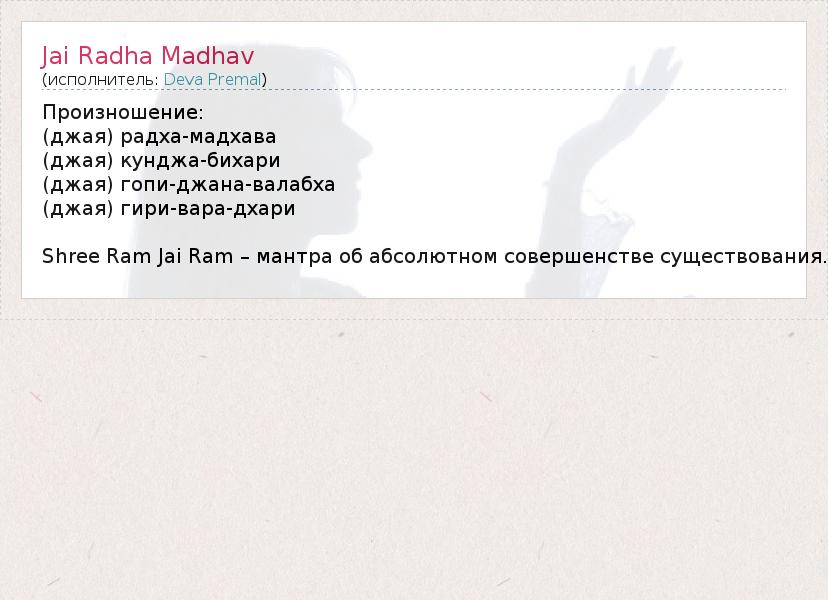 Произношение: (джая) радха-мадхава (джая) кунджа-бихари (джая) гопи-джана-валабха (джая) гири-вара-дхари Shree Ram Jai Ram – мантра об абсолютном совершенстве существования.