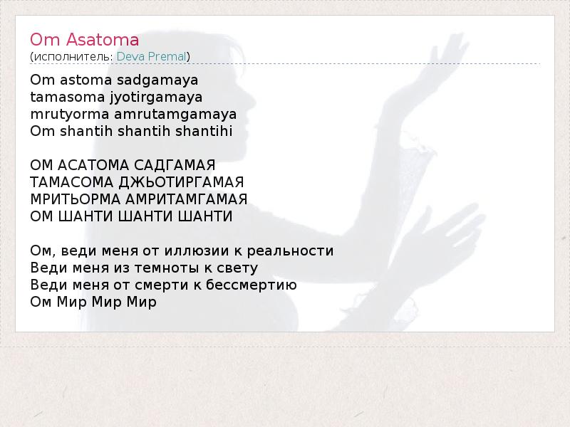 Om astoma sadgamaya tamasoma jyotirgamaya mrutyorma amrutamgamaya Om shantih shantih shantihi ОМ АСАТОМА САДГАМАЯ ТАМАСОМА ДЖЬОТИРГАМАЯ МРИТЬОРМА АМРИТАМГАМАЯ ОМ ШАНТИ ШАНТИ ШАНТИ Ом, веди меня от иллюзии к реальности Веди меня из темноты к свету Веди меня от смерти к бессмертию Ом Мир Мир Мир