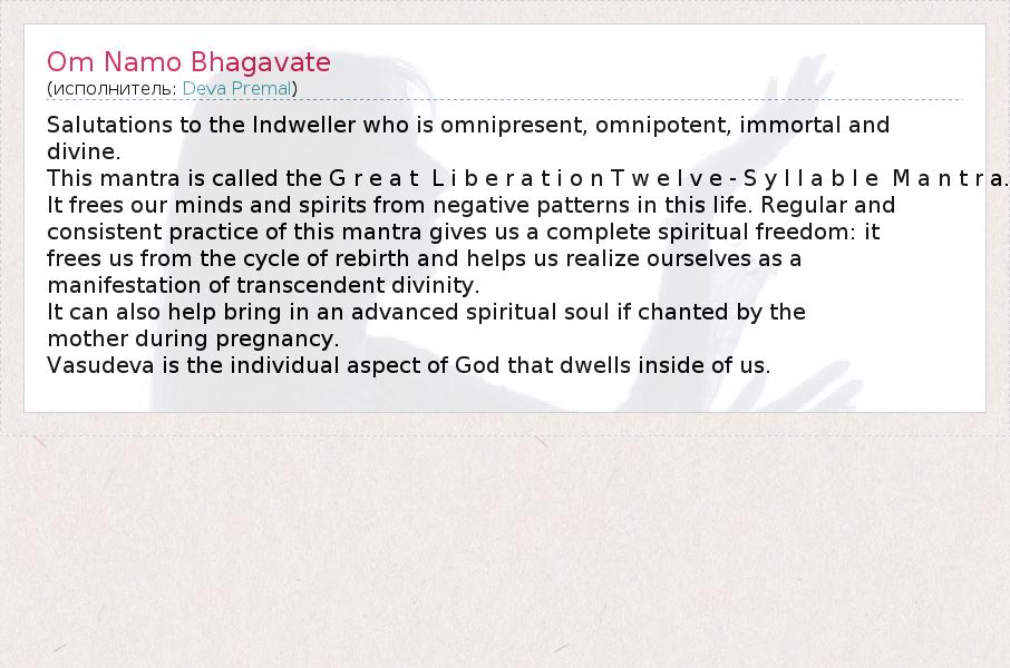 Salutations to the Indweller who is omnipresent, omnipotent, immortal and divine. This mantra is called the G r e a t L i b e r a t i o n T w e l v e - S y l l a b l e M a n t r a. It frees our minds and spirits from negative patterns in this life. Regular and consistent practice of this mantra gives us a complete spiritual freedom: it frees us from the cycle of rebirth and helps us realize ourselves as a manifestation of transcendent divinity. It can also help bring in an advanced spiritual soul if chanted by the mother during pregnancy. Vasudeva is the individual aspect of God that dwells inside of us.