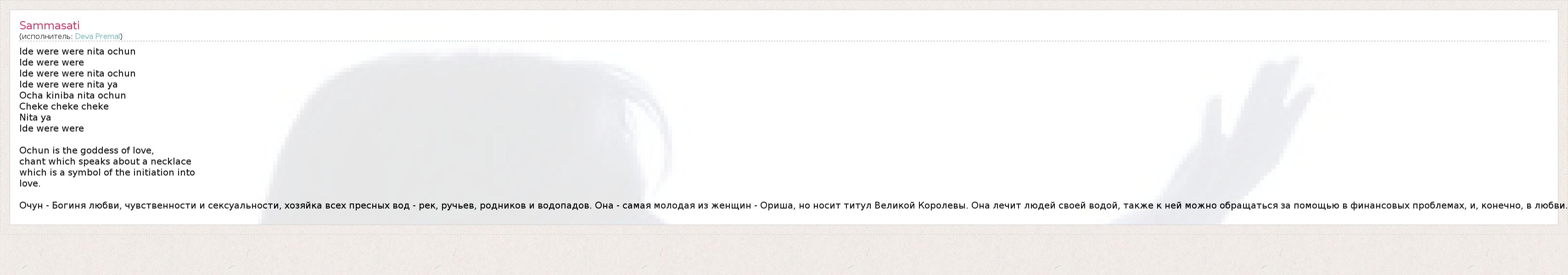 Ide were were nita ochun Ide were were Ide were were nita ochun Ide were were nita ya Ocha kiniba nita ochun Cheke cheke cheke Nita ya Ide were were Ochun is the goddess of love, chant which speaks about a necklace which is a symbol of the initiation into love. Очун - Богиня любви, чувственности и сексуальности, хозяйка всех пресных вод - рек, ручьев, родников и водопадов. Она - самая молодая из женщин - Ориша, но носит титул Великой Королевы. Она лечит людей своей водой, также к ней можно обращаться за помощью в финансовых проблемах, и, конечно, в любви.