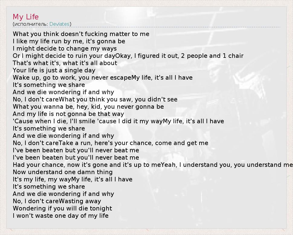 'Cause when I die, I'll smile 'cause I did it my wayMy life, it's all I have