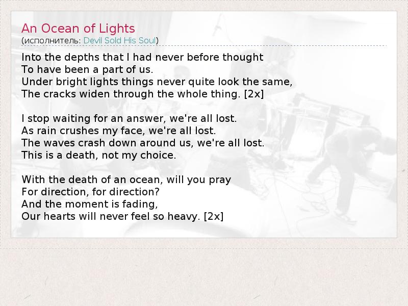 Into the depths that I had never before thought To have been a part of us. Under bright lights things never quite look the same, The cracks widen through the whole thing. [2x] I stop waiting for an answer, we're all lost. As rain crushes my face, we're all lost. The waves crash down around us, we're all lost. This is a death, not my choice. With the death of an ocean, will you pray For direction, for direction? And the moment is fading, Our hearts will never feel so heavy. [2x]
