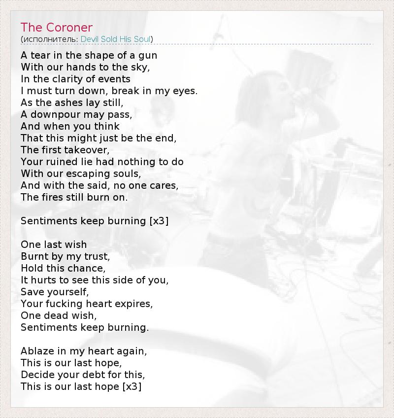 Это интересно:Devil Sold His Soul — группа из города Лондон, Англия. Знаменитая крайне атмосферными композициями и непревзойденным умением сочетать агрессию и лиричность, злобу и красоту, в целом их стиль можно охарактеризовать как post-metal. Образовались в 2004 году после распада своего первого проекта — Mahumodo.Состав:Paul Green — вокалJonny Renshaw — гитараRichard Chapple — гитараJozef Norocky — басPaul Kitney — электроника... продолжение
