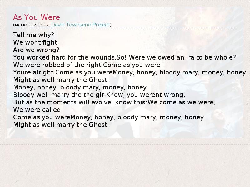 Tell me why? We wont fight. Are we wrong? You worked hard for the wounds.So! Were we owed an ira to be whole? We were robbed of the right.Come as you were Youre alright Come as you wereMoney, honey, bloody mary, money, honey Might as well marry the Ghost. Money, honey, bloody mary, money, honey Bloody well marry the the girlKnow, you werent wrong, But as the moments will evolve, know this:We come as we were, We were called. Come as you wereMoney, honey, bloody mary, money, honey Might as well marry the Ghost.