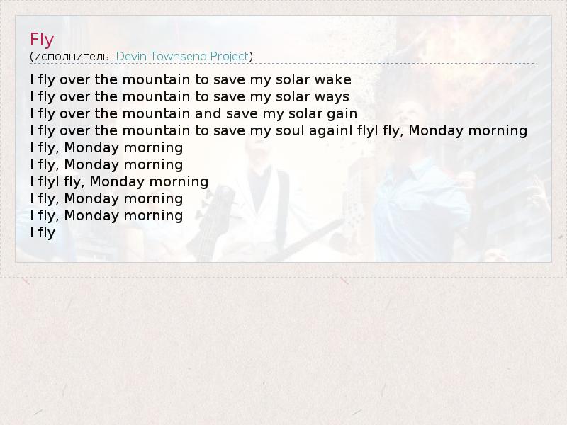 I fly over the mountain to save my solar wake I fly over the mountain to save my solar ways I fly over the mountain and save my solar gain I fly over the mountain to save my soul againI flyI fly, Monday morning I fly, Monday morning I fly, Monday morning I flyI fly, Monday morning I fly, Monday morning I fly, Monday morning I fly