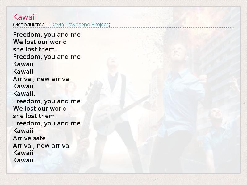 Freedom, you and me We lost our world she lost them. Freedom, you and me Kawaii Kawaii Arrival, new arrival Kawaii Kawaii. Freedom, you and me We lost our world she lost them. Freedom, you and me Kawaii Arrive safe. Arrival, new arrival Kawaii Kawaii.