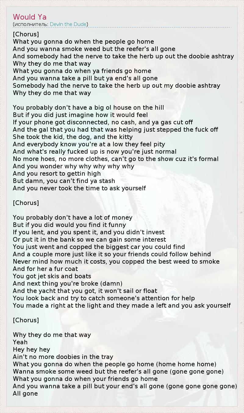 Это интересно:Devin Copeland aka Devin aka Devin The Dude это известный MC из Хьюстона. Долгое время был подписан на Rap-A-Lot Records (в 2008 перешел на Razor & Tie из-за разногласий с Rap-A-Lot).Начал Дэвин карьеру как участник группы Odd Squad aka Coughee Brothaz подписанной на Rap-a-Lot. Первый сольник вышел в 98 и назывался The Dude (всего альбомов 6, не считая сборники). Побывал на фичерингах у Dr. Dre, De La Soul, Dilated Peoples и др.Его фирменный стиль это неторопливая... продолжение