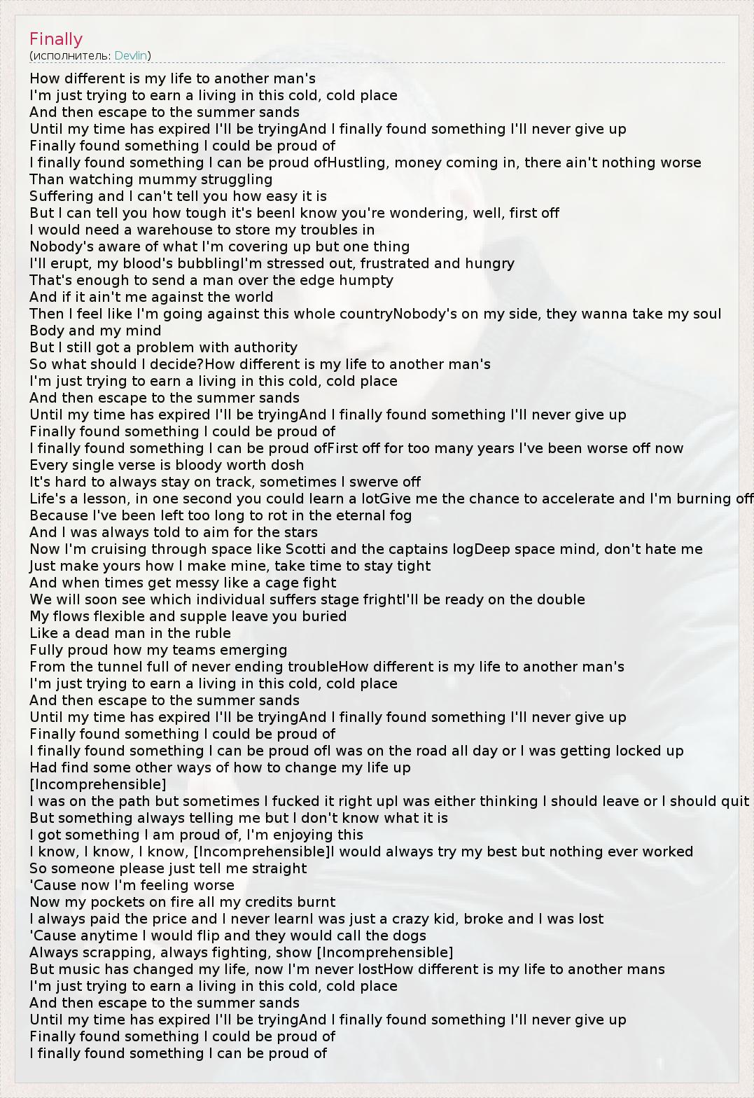 Это интересно:Житель Дэгенхэма, Девлин, потратил несколько лет на то, чтобы выпустить свою глубокую, самоотверженную лирику за границы Восточного Лондона и утвердить свою ценность на границе севера и юга. Сейчас это необычно, видеть Дэвлина причиной бойни на сцене в Нортгемптоне или заказывая билеты на шоу в Амстердаме.В возрасте 18 лет его можно было описать как культ, за которым следовали приверженцы,... продолжение
