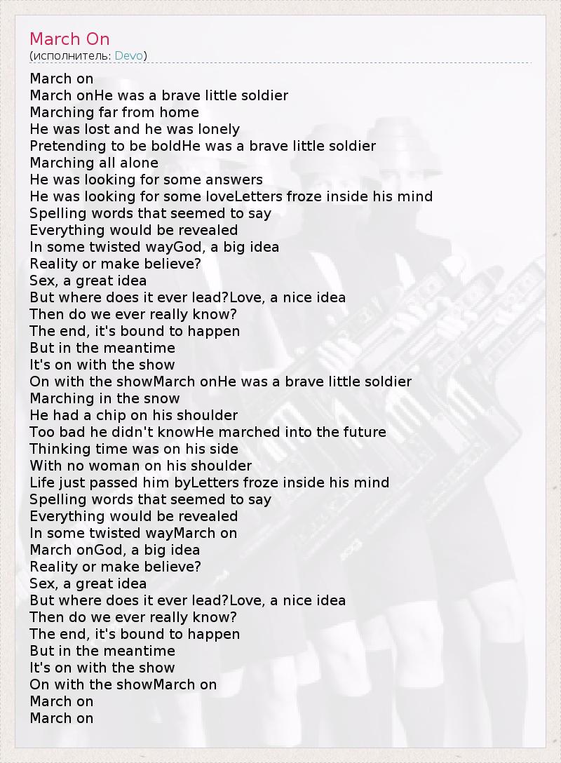 March on March onHe was a brave little soldier Marching far from home He was lost and he was lonely Pretending to be boldHe was a brave little soldier Marching all alone He was looking for some answers He was looking for some loveLetters froze inside his mind Spelling words that seemed to say Everything would be revealed In some twisted wayGod, a big idea Reality or make believe? Sex, a great idea But where does it ever lead?Love, a nice idea Then do we ever really know? The end, it's bound to happen But in the meantime It's on with the show On with the showMarch onHe was a brave little soldier Marching in the snow He had a chip on his shoulder Too bad he didn't knowHe marched into the future Thinking time was on his side With no woman on his shoulder Life just passed him byLetters froze inside his mind Spelling words that seemed to say Everything would be revealed In some twisted wayMarch on March onGod, a big idea Reality or make believe? Sex, a great idea But where does it ever lead?Love, a nice idea Then do we ever really know? The end, it's bound to happen But in the meantime It's on with the show On with the showMarch on March on March on