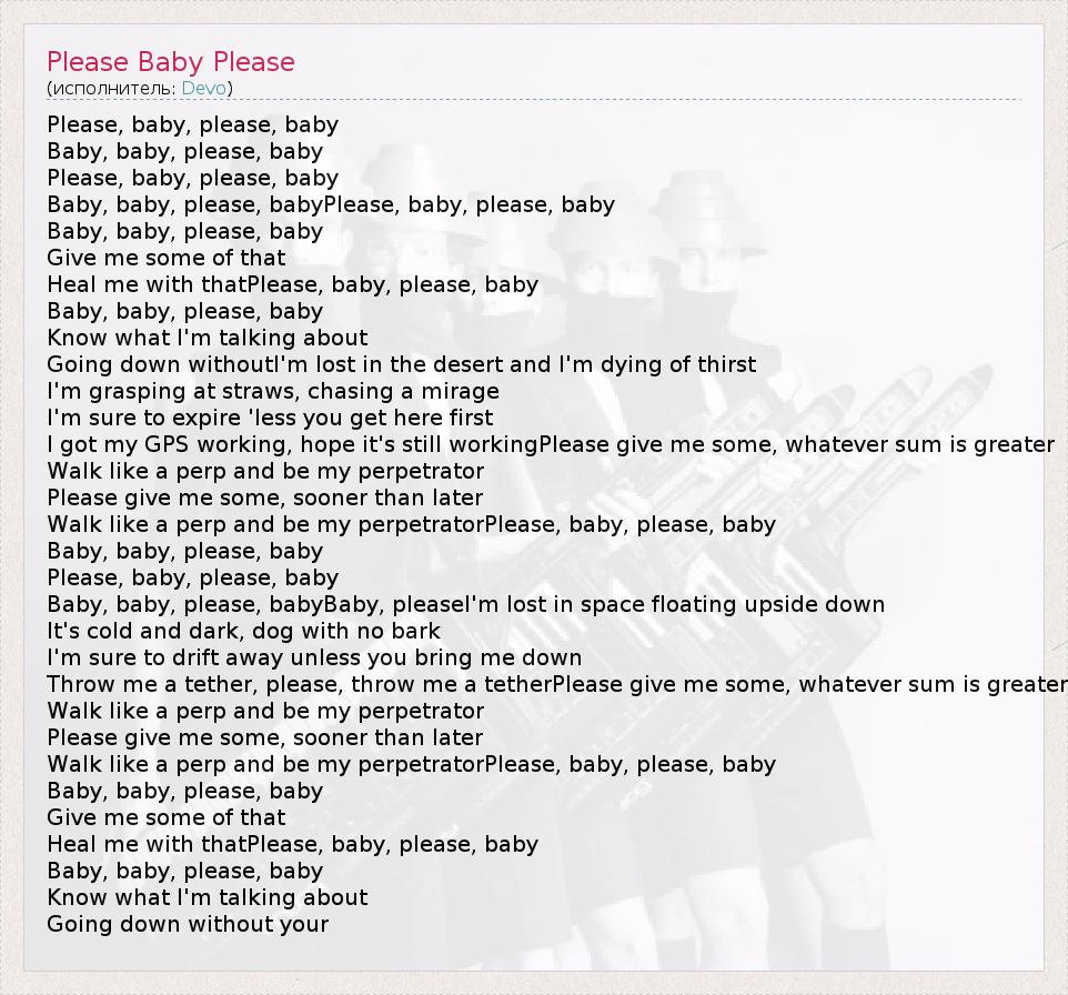 Please, baby, please, baby Baby, baby, please, baby Please, baby, please, baby Baby, baby, please, babyPlease, baby, please, baby Baby, baby, please, baby Give me some of that Heal me with thatPlease, baby, please, baby Baby, baby, please, baby Know what I'm talking about Going down withoutI'm lost in the desert and I'm dying of thirst I'm grasping at straws, chasing a mirage I'm sure to expire 'less you get here first I got my GPS working, hope it's still workingPlease give me some, whatever sum is greater Walk like a perp and be my perpetrator Please give me some, sooner than later Walk like a perp and be my perpetratorPlease, baby, please, baby Baby, baby, please, baby Please, baby, please, baby Baby, baby, please, babyBaby, pleaseI'm lost in space floating upside down It's cold and dark, dog with no bark I'm sure to drift away unless you bring me down Throw me a tether, please, throw me a tetherPlease give me some, whatever sum is greater Walk like a perp and be my perpetrator Please give me some, sooner than later Walk like a perp and be my perpetratorPlease, baby, please, baby Baby, baby, please, baby Give me some of that Heal me with thatPlease, baby, please, baby Baby, baby, please, baby Know what I'm talking about Going down without your