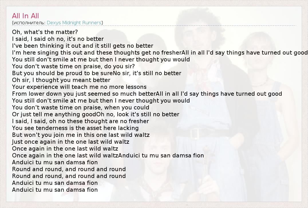 I'm here singing this out and these thoughts get no fresherAll in all I'd say things have turned out good