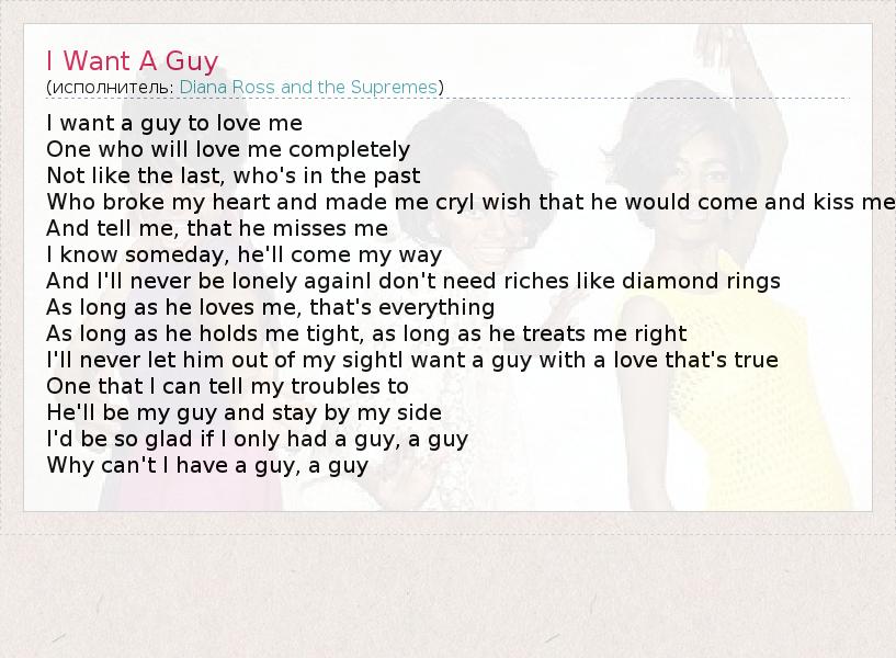 I want a guy to love me One who will love me completely Not like the last, who's in the past Who broke my heart and made me cryI wish that he would come and kiss me And tell me, that he misses me I know someday, he'll come my way And I'll never be lonely againI don't need riches like diamond rings As long as he loves me, that's everything As long as he holds me tight, as long as he treats me right I'll never let him out of my sightI want a guy with a love that's true One that I can tell my troubles to He'll be my guy and stay by my side I'd be so glad if I only had a guy, a guy Why can't I have a guy, a guy