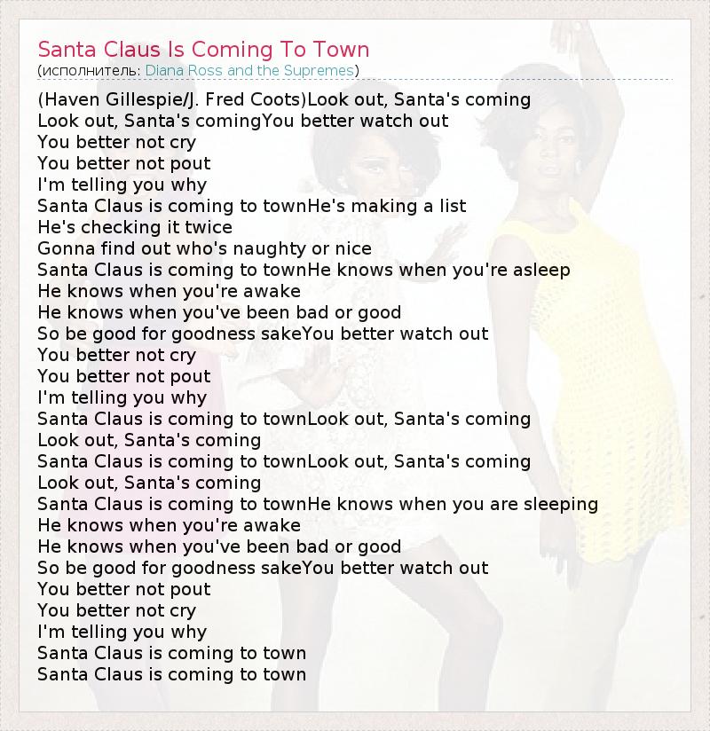 (Haven Gillespie/J. Fred Coots)Look out, Santa's coming Look out, Santa's comingYou better watch out You better not cry You better not pout I'm telling you why Santa Claus is coming to townHe's making a list He's checking it twice Gonna find out who's naughty or nice Santa Claus is coming to townHe knows when you're asleep He knows when you're awake He knows when you've been bad or good So be good for goodness sakeYou better watch out You better not cry You better not pout I'm telling you why Santa Claus is coming to townLook out, Santa's coming Look out, Santa's coming Santa Claus is coming to townLook out, Santa's coming Look out, Santa's coming Santa Claus is coming to townHe knows when you are sleeping He knows when you're awake He knows when you've been bad or good So be good for goodness sakeYou better watch out You better not pout You better not cry I'm telling you why Santa Claus is coming to town Santa Claus is coming to town