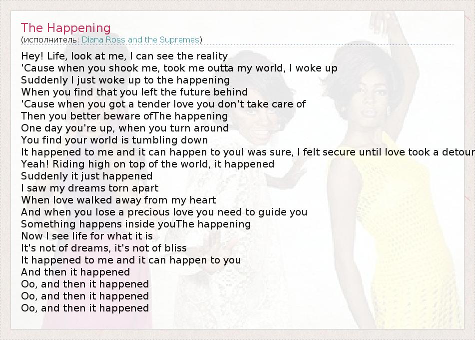 Hey! Life, look at me, I can see the reality 'Cause when you shook me, took me outta my world, I woke up Suddenly I just woke up to the happening When you find that you left the future behind 'Cause when you got a tender love you don't take care of Then you better beware ofThe happening One day you're up, when you turn around You find your world is tumbling down It happened to me and it can happen to youI was sure, I felt secure until love took a detour Yeah! Riding high on top of the world, it happened Suddenly it just happened I saw my dreams torn apart When love walked away from my heart And when you lose a precious love you need to guide you Something happens inside youThe happening Now I see life for what it is It's not of dreams, it's not of bliss It happened to me and it can happen to you And then it happened Oo, and then it happened Oo, and then it happened Oo, and then it happened