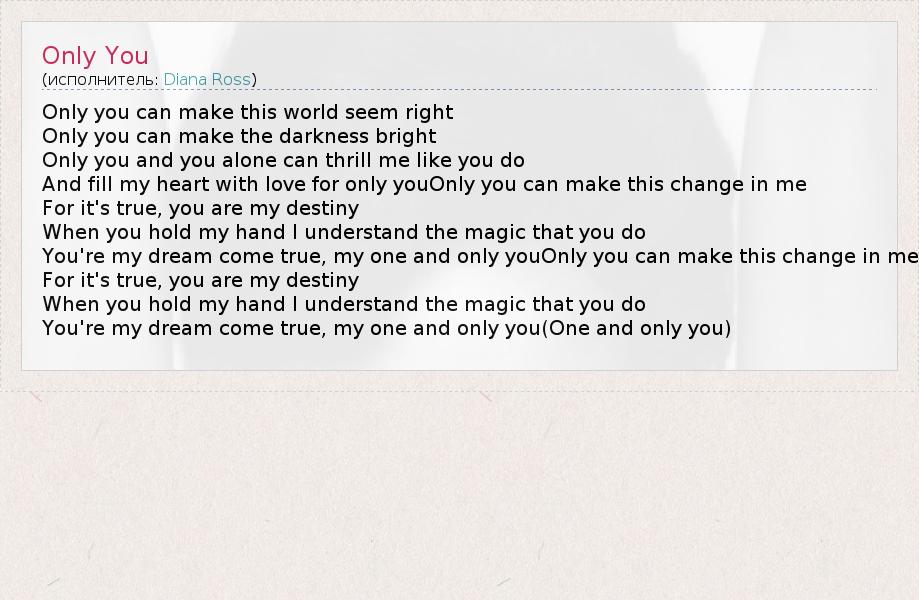 Only you can make this world seem right Only you can make the darkness bright Only you and you alone can thrill me like you do And fill my heart with love for only youOnly you can make this change in me For it's true, you are my destiny When you hold my hand I understand the magic that you do You're my dream come true, my one and only youOnly you can make this change in me For it's true, you are my destiny When you hold my hand I understand the magic that you do You're my dream come true, my one and only you(One and only you)