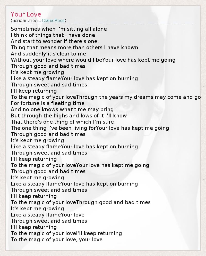 Sometimes when I'm sitting all alone I think of things that I have done And start to wonder if there's one Thing that means more than others I have known And suddenly it's clear to me Without your love where would I beYour love has kept me going Through good and bad times It's kept me growing Like a steady flameYour love has kept on burning Through sweet and sad times I'll keep returning To the magic of your loveThrough the years my dreams may come and go For fortune is a fleeting time And no one knows what time may bring But through the highs and lows of it I'll know That there's one thing of which I'm sure The one thing I've been living forYour love has kept me going Through good and bad times It's kept me growing Like a steady flameYour love has kept on burning Through sweet and sad times I'll keep returning To the magic of your loveYour love has kept me going Through good and bad times It's kept me growing Like a steady flameYour love has kept on burning Through sweet and sad times I'll keep returning To the magic of your loveThrough good and bad times It's kept me growing Like a steady flameYour love Through sweet and sad times I'll keep returning To the magic of your loveI'll keep returning To the magic of your love, your love
