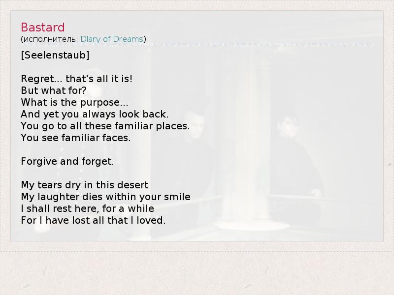 [Seelenstaub] Regret... that's all it is! But what for? What is the purpose... And yet you always look back. You go to all these familiar places. You see familiar faces. Forgive and forget. My tears dry in this desert My laughter dies within your smile I shall rest here, for a while For I have lost all that I loved.