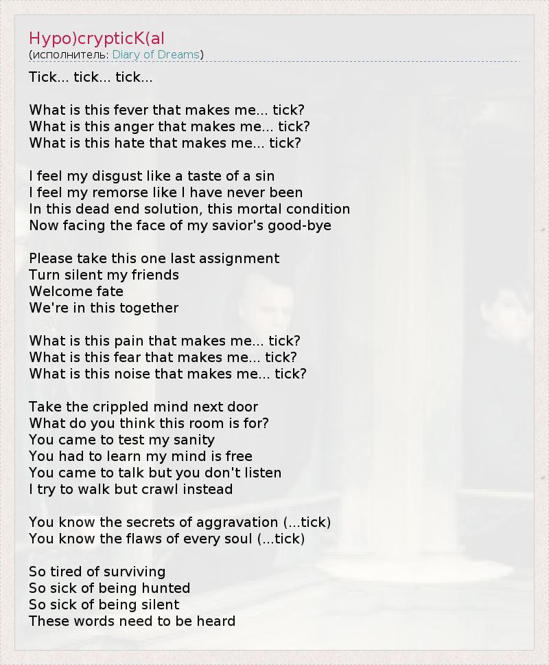 Tick... tick... tick... What is this fever that makes me... tick? What is this anger that makes me... tick? What is this hate that makes me... tick? I feel my disgust like a taste of a sin I feel my remorse like I have never been In this dead end solution, this mortal condition Now facing the face of my savior's good-bye Please take this one last assignment Turn silent my friends Welcome fate We're in this together What is this pain that makes me... tick? What is this fear that makes me... tick? What is this noise that makes me... tick? Take the crippled mind next door What do you think this room is for? You came to test my sanity You had to learn my mind is free You came to talk but you don't listen I try to walk but crawl instead You know the secrets of aggravation (...tick) You know the flaws of every soul (...tick) So tired of surviving So sick of being hunted So sick of being silent These words need to be heard