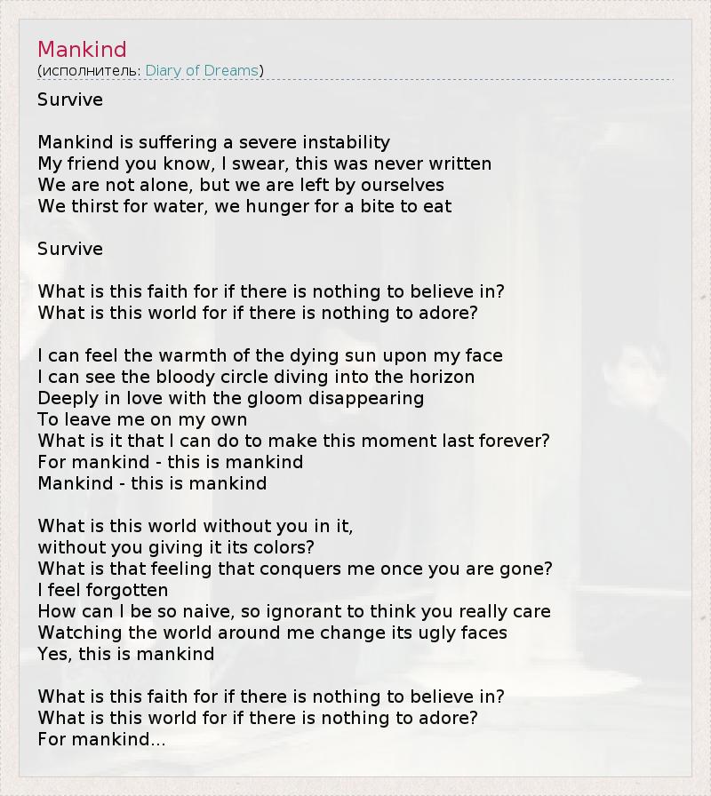 Survive Mankind is suffering a severe instability My friend you know, I swear, this was never written We are not alone, but we are left by ourselves We thirst for water, we hunger for a bite to eat Survive What is this faith for if there is nothing to believe in? What is this world for if there is nothing to adore? I can feel the warmth of the dying sun upon my face I can see the bloody circle diving into the horizon Deeply in love with the gloom disappearing To leave me on my own What is it that I can do to make this moment last forever? For mankind - this is mankind Mankind - this is mankind What is this world without you in it, without you giving it its colors? What is that feeling that conquers me once you are gone? I feel forgotten How can I be so naive, so ignorant to think you really care Watching the world around me change its ugly faces Yes, this is mankind What is this faith for if there is nothing to believe in? What is this world for if there is nothing to adore? For mankind...
