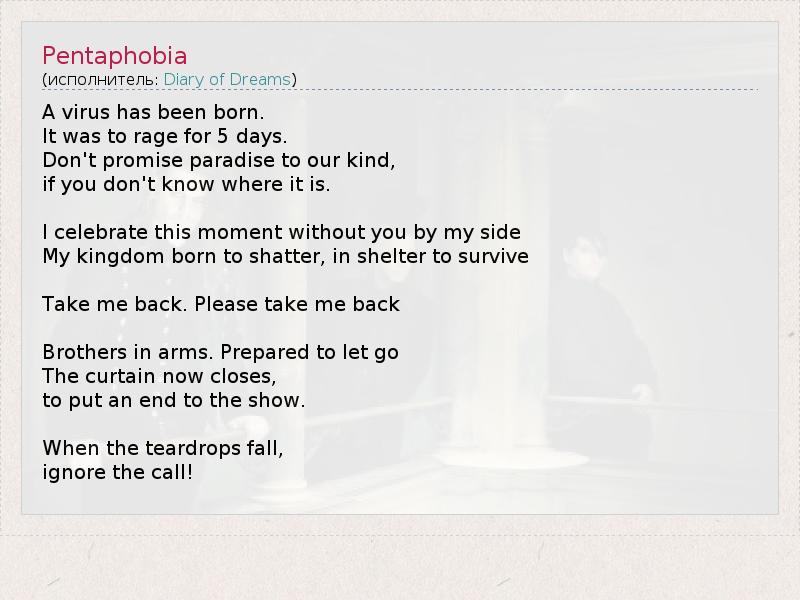 Вирус был рожден. Он должен был свирепствовать 5 дней Не обещай рай нашему роду, Если ты не знаешь, где он находится. Я праздную это мгновение и тебя нет рядом со мной; Моё королевство, рожденноё, чтобы разрушиться, выживет в укрытии. Забери меня назад. Пожалуйста, забери меня назад. Братья по оружию. Приготовились отпустить. Сейчас опускается занавес, Чтобы положить конец спектаклю. Когда капли слез падают, Игнорируй зов! * – Пентафобия – боязнь числа пять.