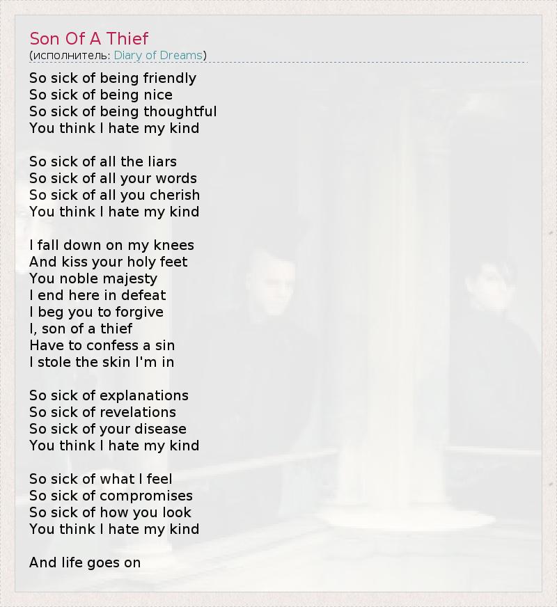 So sick of being friendly So sick of being nice So sick of being thoughtful You think I hate my kind So sick of all the liars So sick of all your words So sick of all you cherish You think I hate my kind I fall down on my knees And kiss your holy feet You noble majesty I end here in defeat I beg you to forgive I, son of a thief Have to confess a sin I stole the skin I'm in So sick of explanations So sick of revelations So sick of your disease You think I hate my kind So sick of what I feel So sick of compromises So sick of how you look You think I hate my kind And life goes on