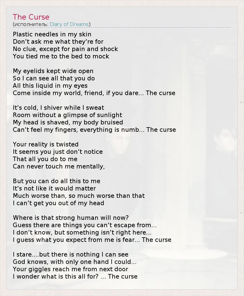 Plastic needles in my skin Don't ask me what they're for No clue, except for pain and shock You tied me to the bed to mock My eyelids kept wide open So I can see all that you do All this liquid in my eyes Come inside my world, friend, if you dare... The curse It's cold, I shiver while I sweat Room without a glimpse of sunlight My head is shaved, my body bruised Can't feel my fingers, everything is numb... The curse Your reality is twisted It seems you just don't notice That all you do to me Can never touch me mentally, But you can do all this to me It's not like it would matter Much worse than, so much worse than that I can't get you out of my head Where is that strong human will now? Guess there are things you can't escape from... I don't know, but something isn't right here... I guess what you expect from me is fear... The curse I stare....but there is nothing I can see God knows, with only one hand I could... Your giggles reach me from next door I wonder what is this all for? ... The curse