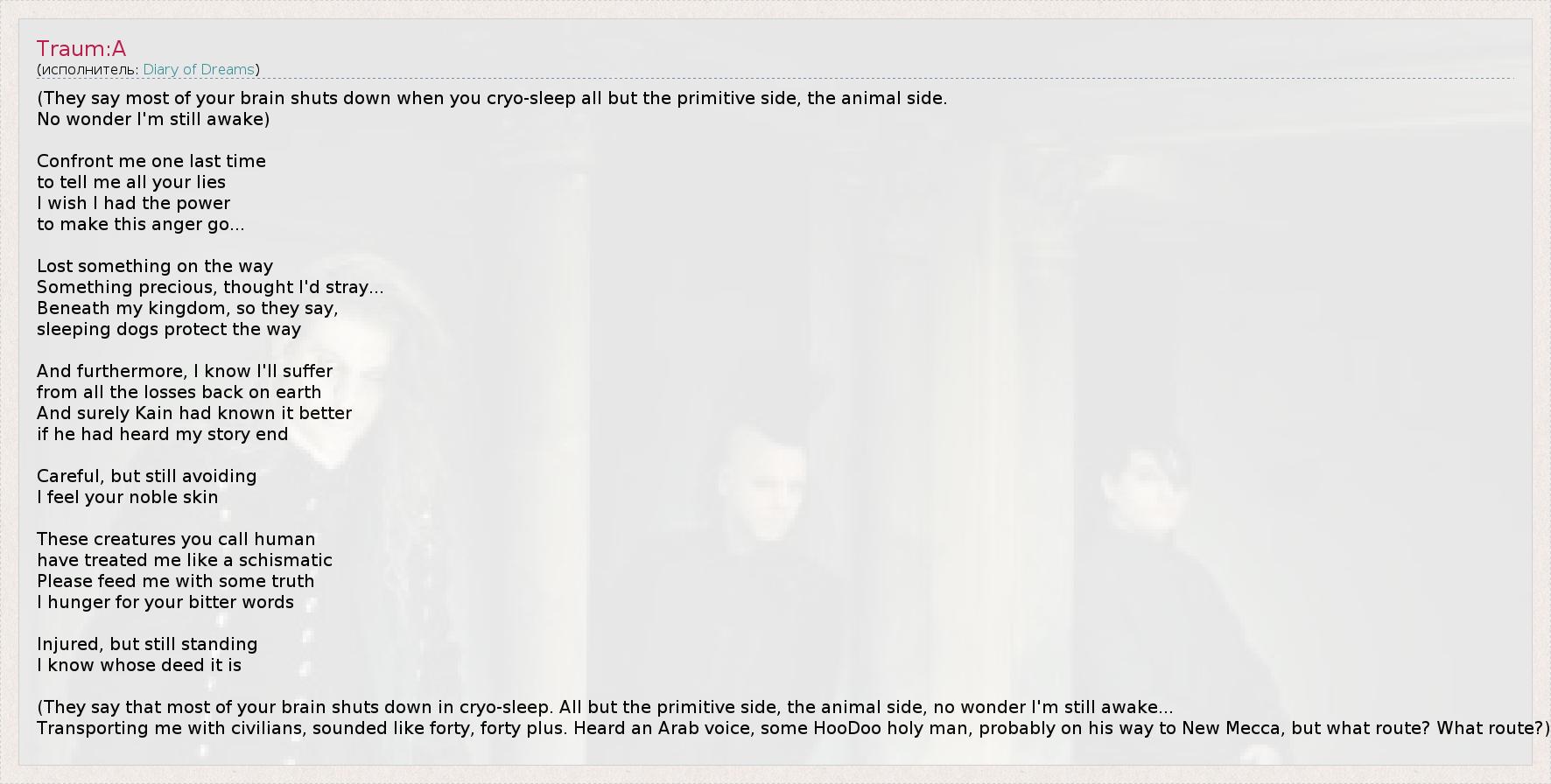 Это интересно:Немецкая группа Diary Of Dreams, основной креативной силой которой является личность владельца Accession Records Адриана Хейтса (Adrian Hates), по праву считается одним из самых необычных и талантливых коллективов на немецкой "тёмной" сцене.История Diary of Dreams берет свое начало в конце восьмидесятых, когда Адриан Хейтс только начал разрабатывать... продолжение