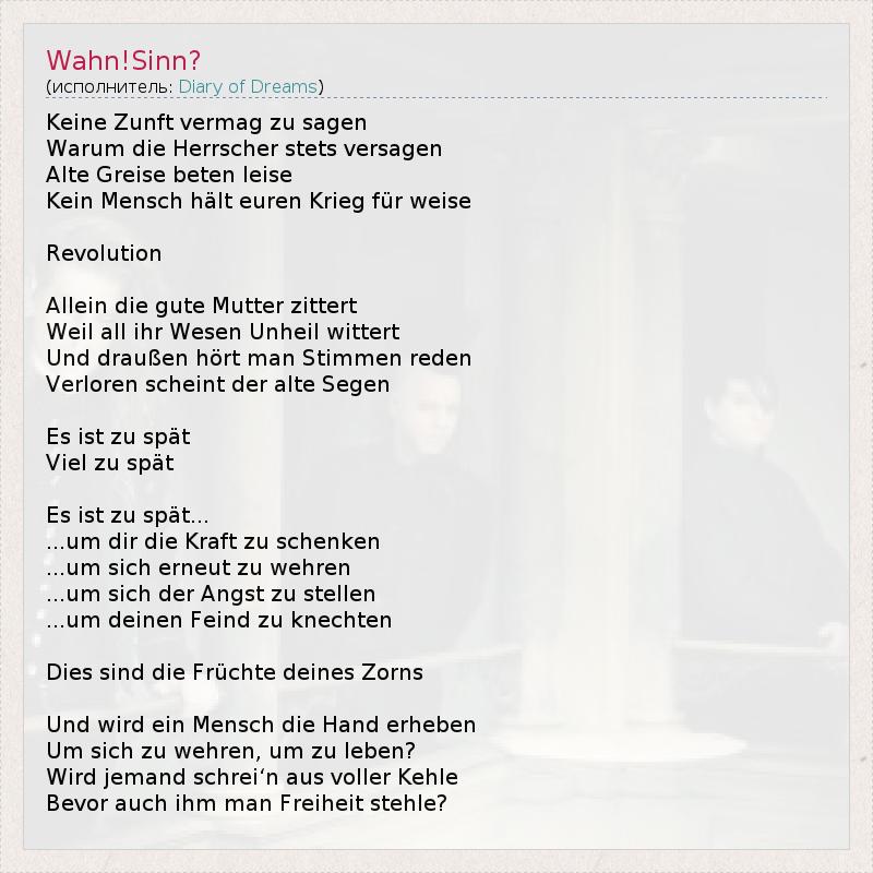 Ни одна гильдия не способна объяснить, Почему правители всегда отказывают. Древние старцы тихо молятся, Никто не считает вашу войну мудрой. Революция... В одиночестве хорошая мать боится, Потому что всем существом чует беду. И снаружи доносятся голоса, Прежнее одобрение, кажется, потеряно. Уже поздно! Слишком поздно! Уже слишком поздно, ...чтобы даровать тебе силу, ...чтобы снова дать отпор, ...чтобы вселить страх, ...чтобы поработить твоего врага. Это плоды твоего гнева! И поднимет ли человек руку, Чтобы дать отпор, чтобы жить? Станет ли кто-то кричать во все горло, Прежде, чем его лишат свободы? * Wahnsinn – безумие, помешательство
