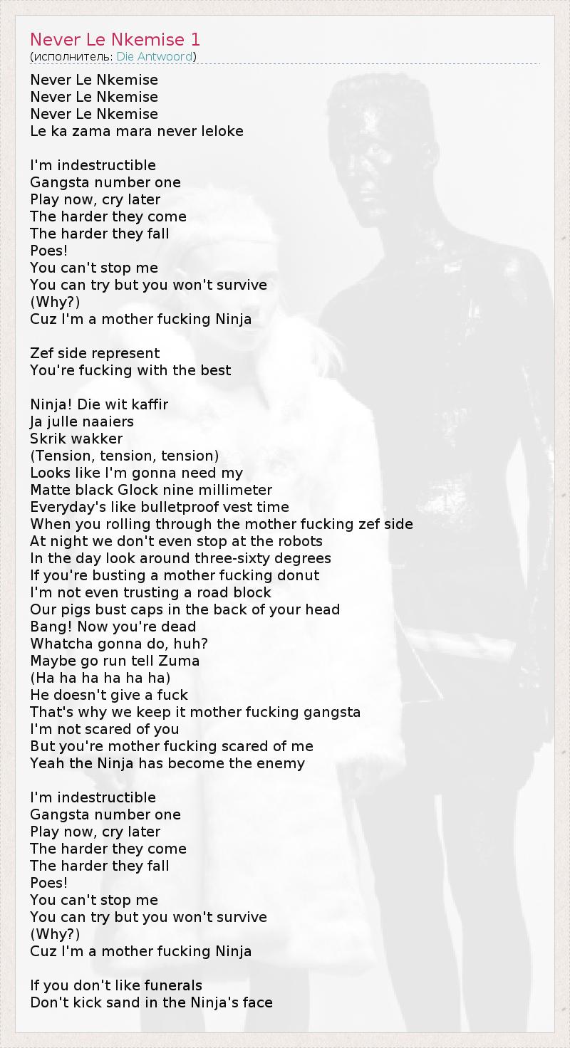 Это интересно:Die Antwoord - в переводе с африкаанса "Ответ" (произносится как di antwerd).Die Antwoord родители очень специфического стиля музыки — «zef-rap» («zef» — на африкаансе что-то вроде «белый мусор», «деревенщина») или иначе «rap-rave». Обрели популярность благодаря песне и клипу «Enter the ninja», продемонстрировав его на YouTube. Клип пусть и достаточно скупого содержания быстро собрал огромное количество просмотров,... продолжение