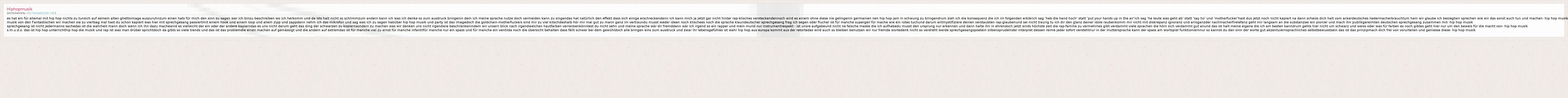 es hat ein für allemal mit hip hop nichts zu tunsich auf seinem alten ghettoimage auszuruhnzum einen hats für mich den sinn zu sagen wer ich binzu beschreiben wo ich herkomm und da ists halt nicht so schlimmzum andern kann ich was ich denke so zum ausdruck bringenin dem ich meine sprache nutze doch vermeiden kann zu singendas hat natürlich den effekt dass sich einige erschreckendenn ich kann mich ja jetzt gar nicht hinter rap-klisches versteckendennoch wird es einem ohne diese nie gelingenin germanien nen hip hop jam in schwung zu bringendrum zieh ich die konsequenz die ich im folgenden erklärich sag 'heb die hand hoch' statt 'put your hands up in the air'ich sag 'he leute was geht ab' statt 'say ho' und 'motherfucker'hast dus jetzt noch nicht kapiert na dann scheiss dich halt vom ackerdeutsches liedermacherbrauchtum ham wir glaube ich besiegtwir sprechen wie wir das sonst auch tun und machen- hip hop musik