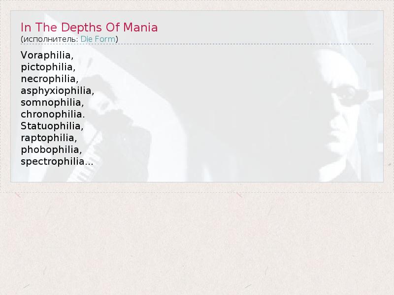 ГлавнаяИсполнителиDie FormIn The Depths Of Mania