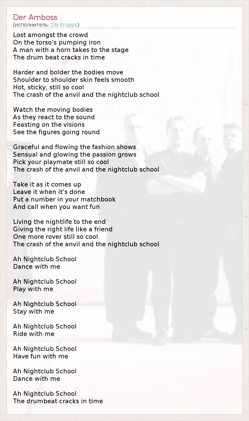 Lost amongst the crowd On the torso's pumping iron A man with a horn takes to the stage The drum beat cracks in time Harder and bolder the bodies move Shoulder to shoulder skin feels smooth Hot, sticky, still so cool The crash of the anvil and the nightclub school Watch the moving bodies As they react to the sound Feasting on the visions See the figures going round Graceful and flowing the fashion shows Sensual and glowing the passion grows Pick your playmate still so cool The crash of the anvil and the nightclub school Take it as it comes up Leave it when it's done Put a number in your matchbook And call when you want fun Living the nightlife to the end Giving the right life like a friend One more rover still so cool The crash of the anvil and the nightclub school Ah Nightclub School Dance with me Ah Nightclub School Play with me Ah Nightclub School Stay with me Ah Nightclub School Ride with me Ah Nightclub School Have fun with me Ah Nightclub School Dance with me Ah Nightclub School The drumbeat cracks in time