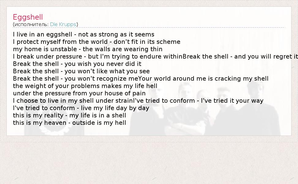 I live in an eggshell - not as strong as it seems I protect myself from the world - don't fit in its scheme my home is unstable - the walls are wearing thin I break under pressure - but I'm trying to endure withinBreak the shell - and you will regret it Break the shell - you wish you never did it Break the shell - you won't like what you see Break the shell - you won't recognize meYour world around me is cracking my shell the weight of your problems makes my life hell under the pressure from your house of pain I choose to live in my shell under strainI've tried to conform - I've tried it your way I've tried to conform - live my life day by day this is my reality - my life is in a shell this is my heaven - outside is my hell