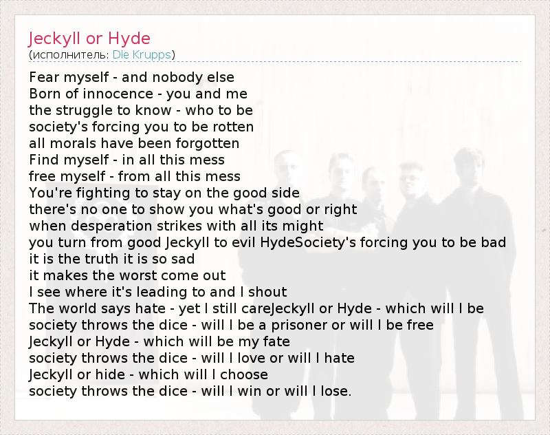 Fear myself - and nobody else Born of innocence - you and me the struggle to know - who to be society's forcing you to be rotten all morals have been forgotten Find myself - in all this mess free myself - from all this mess You're fighting to stay on the good side there's no one to show you what's good or right when desperation strikes with all its might you turn from good Jeckyll to evil HydeSociety's forcing you to be bad it is the truth it is so sad it makes the worst come out I see where it's leading to and I shout The world says hate - yet I still careJeckyll or Hyde - which will I be society throws the dice - will I be a prisoner or will I be free Jeckyll or Hyde - which will be my fate society throws the dice - will I love or will I hate Jeckyll or hide - which will I choose society throws the dice - will I win or will I lose.