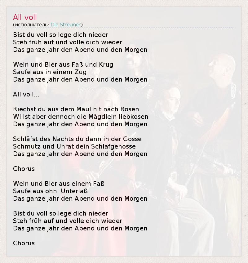 Bist du voll so lege dich nieder Steh früh auf und volle dich wieder Das ganze Jahr den Abend und den Morgen Wein und Bier aus Faß und Krug Saufe aus in einem Zug Das ganze Jahr den Abend und den Morgen All voll... Riechst du aus dem Maul nit nach Rosen Willst aber dennoch die Mägdlein liebkosen Das ganze Jahr den Abend und den Morgen Schläfst des Nachts du dann in der Gosse Schmutz und Unrat dein Schlafgenosse Das ganze Jahr den Abend und den Morgen Chorus Wein und Bier aus einem Faß Saufe aus ohn' Unterlaß Das ganze Jahr den Abend und den Morgen Bist du voll so lege dich nieder Steh früh auf und volle dich wieder Das ganze Jahr den Abend und den Morgen Chorus