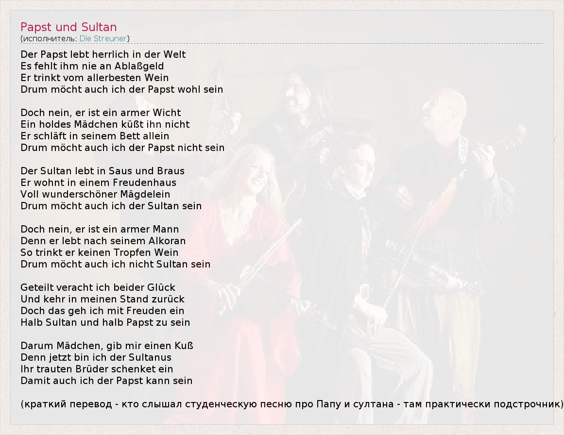 Der Papst lebt herrlich in der Welt Es fehlt ihm nie an Ablaßgeld Er trinkt vom allerbesten Wein Drum möcht auch ich der Papst wohl sein Doch nein, er ist ein armer Wicht Ein holdes Mädchen küßt ihn nicht Er schläft in seinem Bett allein Drum möcht auch ich der Papst nicht sein Der Sultan lebt in Saus und Braus Er wohnt in einem Freudenhaus Voll wunderschöner Mägdelein Drum möcht auch ich der Sultan sein Doch nein, er ist ein armer Mann Denn er lebt nach seinem Alkoran So trinkt er keinen Tropfen Wein Drum möcht auch ich nicht Sultan sein Geteilt veracht ich beider Glück Und kehr in meinen Stand zurück Doch das geh ich mit Freuden ein Halb Sultan und halb Papst zu sein Darum Mädchen, gib mir einen Kuß Denn jetzt bin ich der Sultanus Ihr trauten Brüder schenket ein Damit auch ich der Papst kann sein (краткий перевод - кто слышал студенческую песню про Папу и султана - там практически подстрочник)