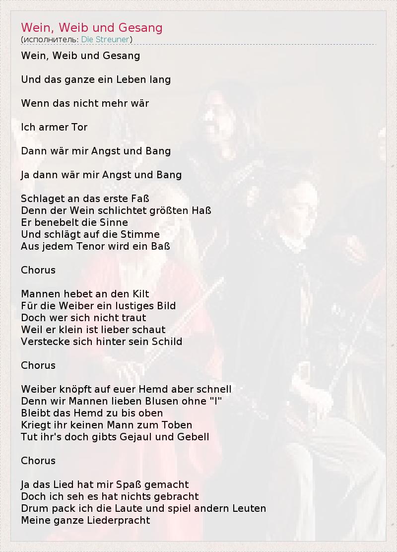 Wein, Weib und Gesang Und das ganze ein Leben lang Wenn das nicht mehr wär Ich armer Tor Dann wär mir Angst und Bang Ja dann wär mir Angst und Bang Schlaget an das erste Faß Denn der Wein schlichtet größten Haß Er benebelt die Sinne Und schlägt auf die Stimme Aus jedem Tenor wird ein Baß Chorus Mannen hebet an den Kilt Für die Weiber ein lustiges Bild Doch wer sich nicht traut Weil er klein ist lieber schaut Verstecke sich hinter sein Schild Chorus Weiber knöpft auf euer Hemd aber schnell Denn wir Mannen lieben Blusen ohne "l" Bleibt das Hemd zu bis oben Kriegt ihr keinen Mann zum Toben Tut ihr's doch gibts Gejaul und Gebell Chorus Ja das Lied hat mir Spaß gemacht Doch ich seh es hat nichts gebracht Drum pack ich die Laute und spiel andern Leuten Meine ganze Liederpracht