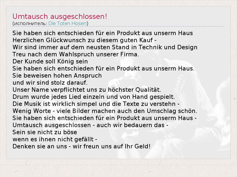 А как ты думаешь, о чем песня "Umtausch ausgeschlossen!" ?