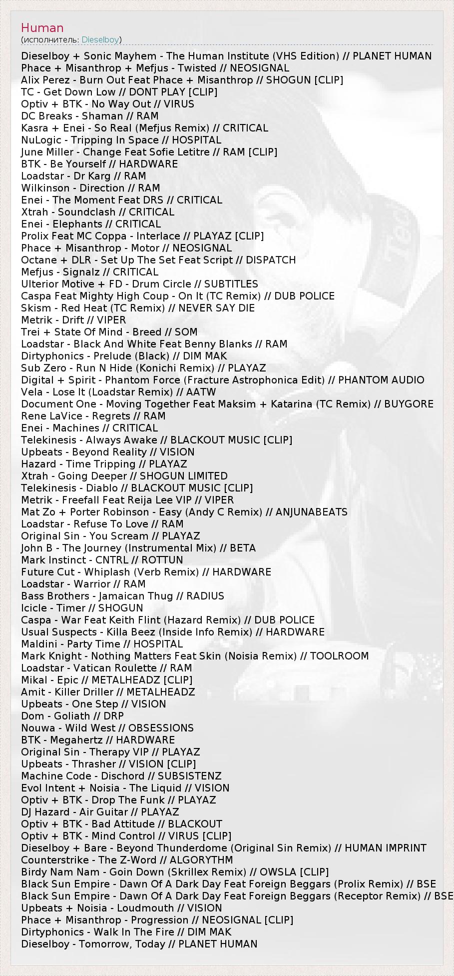 Dieselboy + Sonic Mayhem - The Human Institute (VHS Edition) // PLANET HUMAN Phace + Misanthrop + Mefjus - Twisted // NEOSIGNAL Alix Perez - Burn Out Feat Phace + Misanthrop // SHOGUN [CLIP] TC - Get Down Low // DONT PLAY [CLIP] Optiv + BTK - No Way Out // VIRUS DC Breaks - Shaman // RAM Kasra + Enei - So Real (Mefjus Remix) // CRITICAL NuLogic - Tripping In Space // HOSPITAL June Miller - Change Feat Sofie Letitre // RAM [CLIP] BTK - Be Yourself // HARDWARE Loadstar - Dr Karg // RAM Wilkinson - Direction // RAM Enei - The Moment Feat DRS // CRITICAL Xtrah - Soundclash // CRITICAL Enei - Elephants // CRITICAL Prolix Feat MC Coppa - Interlace // PLAYAZ [CLIP] Phace + Misanthrop - Motor // NEOSIGNAL Octane + DLR - Set Up The Set Feat Script // DISPATCH Mefjus - Signalz // CRITICAL Ulterior Motive + FD - Drum Circle // SUBTITLES Caspa Feat Mighty High Coup - On It (TC Remix) // DUB POLICE Skism - Red Heat (TC Remix) // NEVER SAY DIE Metrik - Drift // VIPER Trei + State Of Mind - Breed // SOM Loadstar - Black And White Feat Benny Blanks // RAM Dirtyphonics - Prelude (Black) // DIM MAK Sub Zero - Run N Hide (Konichi Remix) // PLAYAZ Digital + Spirit - Phantom Force (Fracture Astrophonica Edit) // PHANTOM AUDIO Vela - Lose It (Loadstar Remix) // AATW Document One - Moving Together Feat Maksim + Katarina (TC Remix) // BUYGORE Rene LaVice - Regrets // RAM Enei - Machines // CRITICAL Telekinesis - Always Awake // BLACKOUT MUSIC [CLIP] Upbeats - Beyond Reality // VISION Hazard - Time Tripping // PLAYAZ Xtrah - Going Deeper // SHOGUN LIMITED Telekinesis - Diablo // BLACKOUT MUSIC [CLIP] Metrik - Freefall Feat Reija Lee VIP // VIPER Mat Zo + Porter Robinson - Easy (Andy C Remix) // ANJUNABEATS Loadstar - Refuse To Love // RAM Original Sin - You Scream // PLAYAZ John B - The Journey (Instrumental Mix) // BETA Mark Instinct - CNTRL // ROTTUN Future Cut - Whiplash (Verb Remix) // HARDWARE Loadstar - Warrior // RAM Bass Brothers - Jamaican Thug // RADIUS Icicle - Timer // SHOGUN Caspa - War Feat Keith Flint (Hazard Remix) // DUB POLICE Usual Suspects - Killa Beez (Inside Info Remix) // HARDWARE Maldini - Party Time // HOSPITAL Mark Knight - Nothing Matters Feat Skin (Noisia Remix) // TOOLROOM Loadstar - Vatican Roulette // RAM Mikal - Epic // METALHEADZ [CLIP] Amit - Killer Driller // METALHEADZ Upbeats - One Step // VISION Dom - Goliath // DRP Nouwa - Wild West // OBSESSIONS BTK - Megahertz // HARDWARE Original Sin - Therapy VIP // PLAYAZ Upbeats - Thrasher // VISION [CLIP] Machine Code - Dischord // SUBSISTENZ Evol Intent + Noisia - The Liquid // VISION Optiv + BTK - Drop The Funk // PLAYAZ DJ Hazard - Air Guitar // PLAYAZ Optiv + BTK - Bad Attitude // BLACKOUT Optiv + BTK - Mind Control // VIRUS [CLIP] Dieselboy + Bare - Beyond Thunderdome (Original Sin Remix) // HUMAN IMPRINT Counterstrike - The Z-Word // ALGORYTHM Birdy Nam Nam - Goin Down (Skrillex Remix) // OWSLA [CLIP] Black Sun Empire - Dawn Of A Dark Day Feat Foreign Beggars (Prolix Remix) // BSE Black Sun Empire - Dawn Of A Dark Day Feat Foreign Beggars (Receptor Remix) // BSE Upbeats + Noisia - Loudmouth // VISION Phace + Misanthrop - Progression // NEOSIGNAL [CLIP] Dirtyphonics - Walk In The Fire // DIM MAK Dieselboy - Tomorrow, Today // PLANET HUMAN