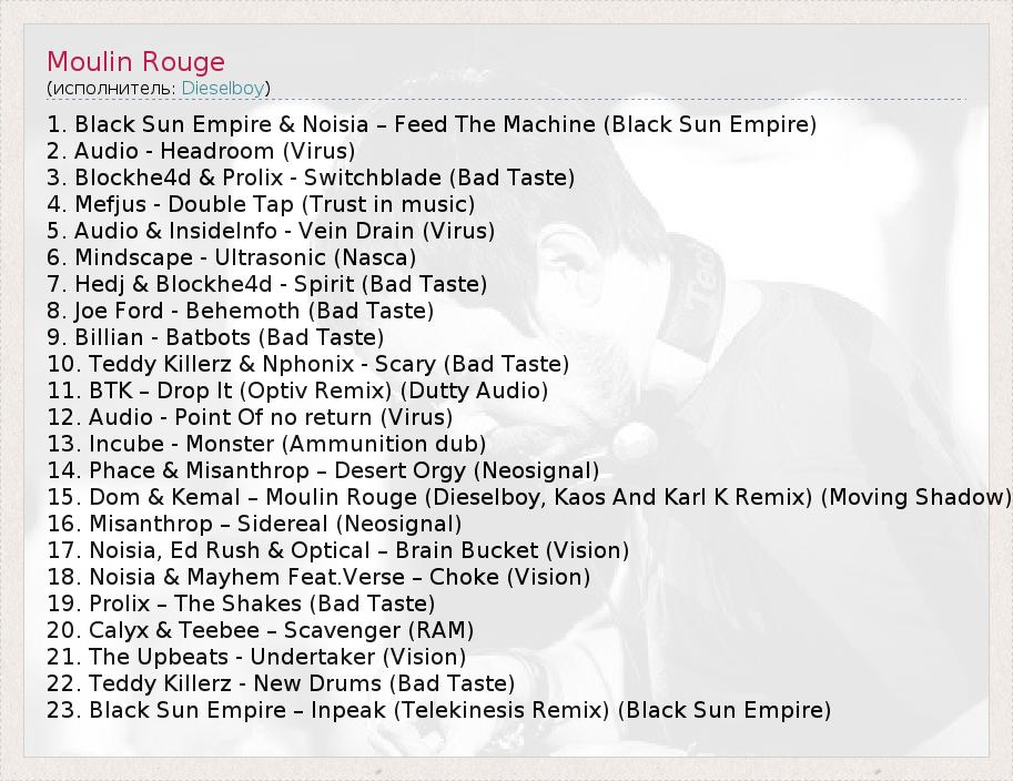 1. Black Sun Empire & AMP; Noisia - Подача машины (Black Sun Empire) 2. Аудио - перемычки (Вирус) 3. Blockhe4d & AMP; Проликс - Switchblade (Bad Taste) 4. Mefjus - Double Tap (Trust) в музыке 5. Аудио & Amp; InsideInfo - вены Слив (Вирус) 6. Mindscape - Ультразвуковая (Наска) 7. Hedj & AMP; Blockhe4d - Дух (Bad Taste) 8. Джо Форд - Бегемот (Bad Taste) 9. Billian - Batbots (Bad Taste) 10. Тедди Killerz & AMP; Nphonix - Страшно (Bad Taste) 11. БТК - Drop It (Remix) Optiv (Dutty аудио) 12. Аудио - Точка невозврата (Вирус) 13. InCube - монстр (Боеприпасы даб) 14. Phace & AMP; Misanthrop - Пустыня оргия (Neosignal) 15. Дом & AMP; Кемаль - Мулен Руж (Dieselboy, Kaos И Карл К Remix) (Moving Shadow) 16. Misanthrop - Звездный (Neosignal) 17. Noisia, Ed Rush & AMP; Оптический - Мозг ковша (Vision) 18. Noisia & AMP; Mayhem Feat.Verse - дроссель (Vision) 19. Проликс - трясет (Bad Taste) 20. Чашечка и усилитель; Teebee - Мусорщик (ОЗУ) 21. Upbeats - Гробовщик (Vision) 22. Тедди Killerz - Новые барабаны (Bad Taste) 23. Black Sun Empire - Inpeak (Телекинез Remix) (Black Sun Empire)