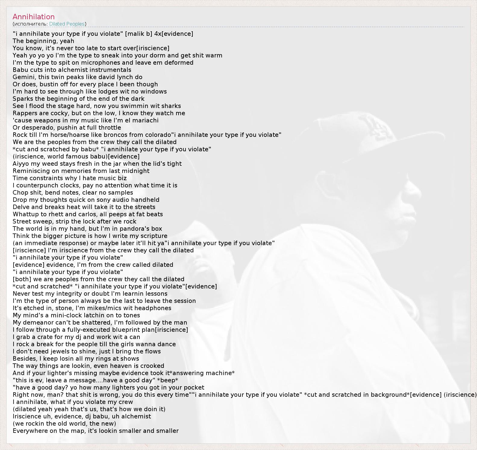 (an immediate response) or maybe later it'll hit ya"i annihilate your type if you violate"