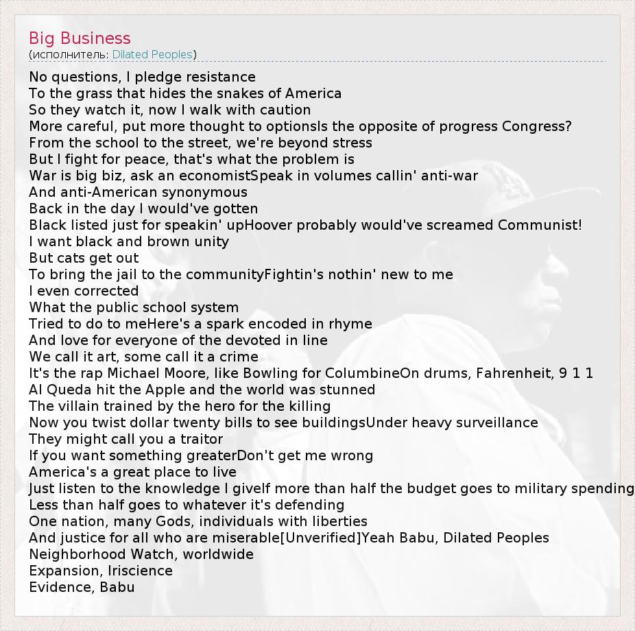 No questions, I pledge resistance To the grass that hides the snakes of America So they watch it, now I walk with caution More careful, put more thought to optionsIs the opposite of progress Congress? From the school to the street, we're beyond stress But I fight for peace, that's what the problem is War is big biz, ask an economistSpeak in volumes callin' anti-war And anti-American synonymous Back in the day I would've gotten Black listed just for speakin' upHoover probably would've screamed Communist! I want black and brown unity But cats get out To bring the jail to the communityFightin's nothin' new to me I even corrected What the public school system Tried to do to meHere's a spark encoded in rhyme And love for everyone of the devoted in line We call it art, some call it a crime It's the rap Michael Moore, like Bowling for ColumbineOn drums, Fahrenheit, 9 1 1 Al Queda hit the Apple and the world was stunned The villain trained by the hero for the killing Now you twist dollar twenty bills to see buildingsUnder heavy surveillance They might call you a traitor If you want something greaterDon't get me wrong America's a great place to live Just listen to the knowledge I giveIf more than half the budget goes to military spending Less than half goes to whatever it's defending One nation, many Gods, individuals with liberties And justice for all who are miserable[Unverified]Yeah Babu, Dilated Peoples Neighborhood Watch, worldwide Expansion, Iriscience Evidence, Babu