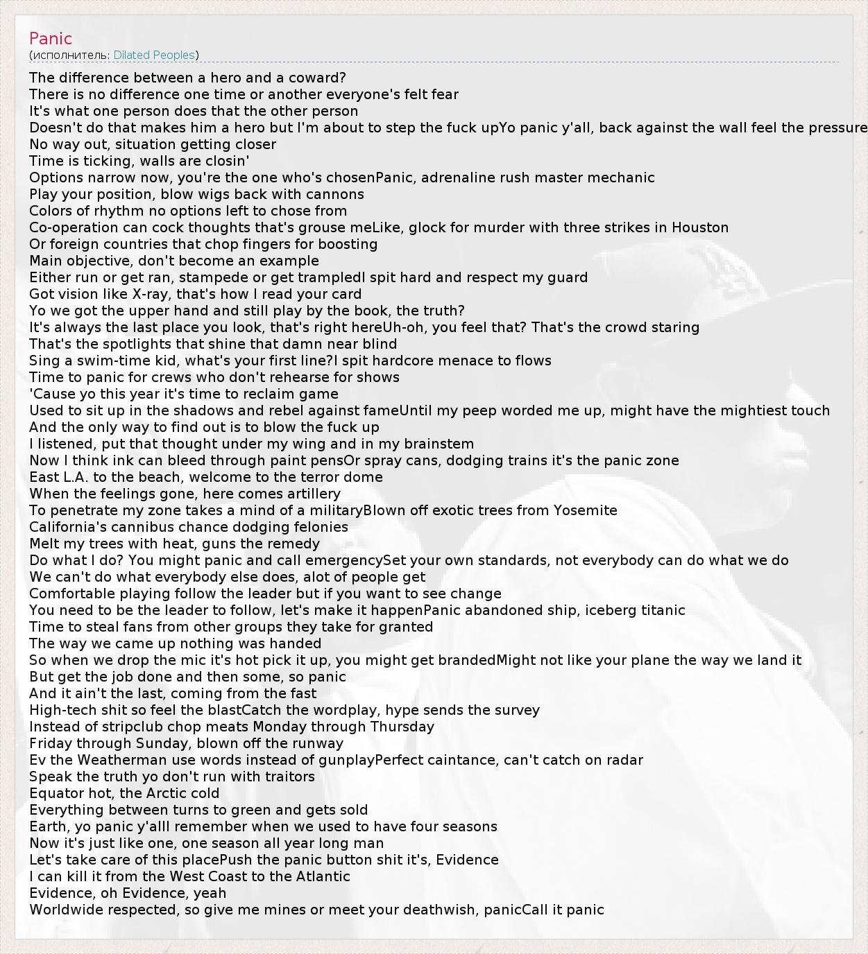 Это интересно:Dilated Peoples – это андеграунд хип-хоп группа из Калифорнии, США. Они могут похвастаться тем, что достигли огромного успеха в андеграунде, хотя малоизвестны в мэйнстриме. Единственным исключением на сегодняшний день является их песня 2004 года "This Way", записанная совместно с Kanye West'ом. В состав группы входят DJ Babu (продюсер/DJ), Evidence (рэппер/продюсер)... продолжение