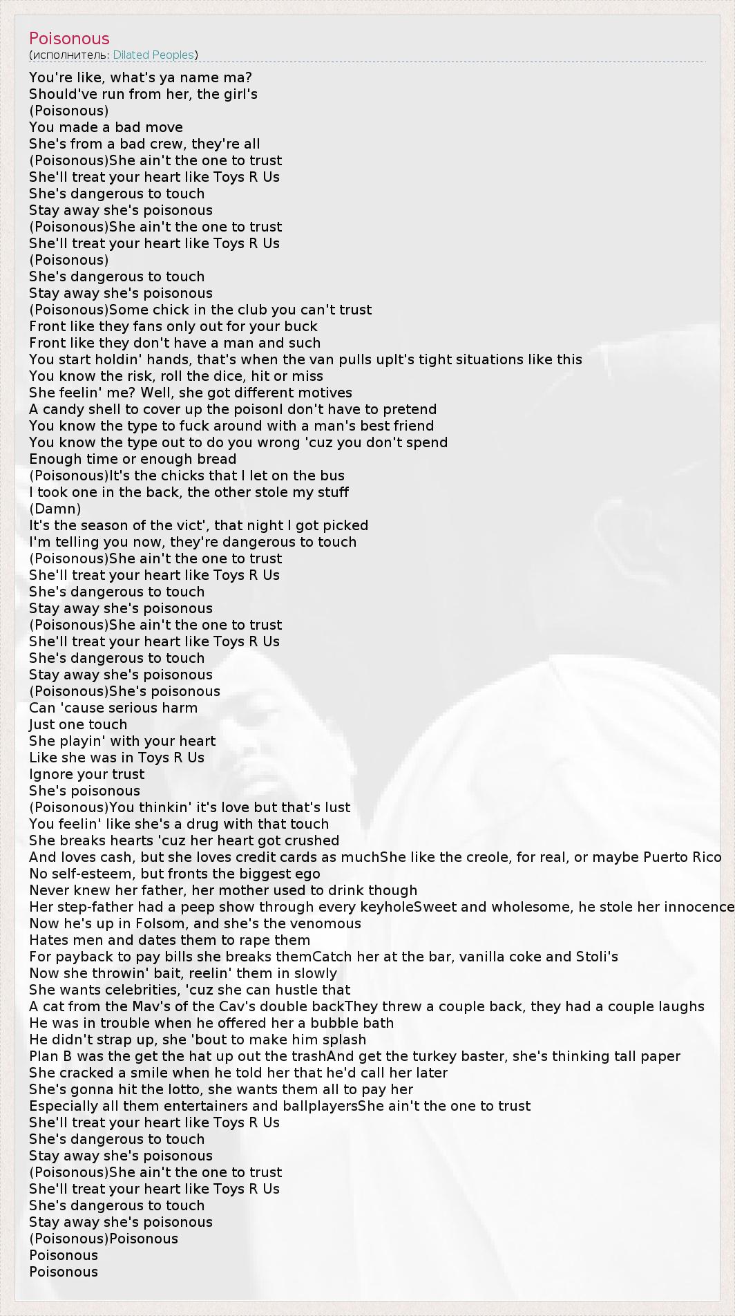 You're like, what's ya name ma? Should've run from her, the girl's (Poisonous) You made a bad move She's from a bad crew, they're all (Poisonous)She ain't the one to trust She'll treat your heart like Toys R Us She's dangerous to touch Stay away she's poisonous (Poisonous)She ain't the one to trust She'll treat your heart like Toys R Us (Poisonous) She's dangerous to touch Stay away she's poisonous (Poisonous)Some chick in the club you can't trust Front like they fans only out for your buck Front like they don't have a man and such You start holdin' hands, that's when the van pulls upIt's tight situations like this You know the risk, roll the dice, hit or miss She feelin' me? Well, she got different motives A candy shell to cover up the poisonI don't have to pretend You know the type to fuck around with a man's best friend You know the type out to do you wrong 'cuz you don't spend Enough time or enough bread (Poisonous)It's the chicks that I let on the bus I took one in the back, the other stole my stuff (Damn) It's the season of the vict', that night I got picked I'm telling you now, they're dangerous to touch (Poisonous)She ain't the one to trust She'll treat your heart like Toys R Us She's dangerous to touch Stay away she's poisonous (Poisonous)She ain't the one to trust She'll treat your heart like Toys R Us She's dangerous to touch Stay away she's poisonous (Poisonous)She's poisonous Can 'cause serious harm Just one touch She playin' with your heart Like she was in Toys R Us Ignore your trust She's poisonous (Poisonous)You thinkin' it's love but that's lust You feelin' like she's a drug with that touch She breaks hearts 'cuz her heart got crushed And loves cash, but she loves credit cards as muchShe like the creole, for real, or maybe Puerto Rico No self-esteem, but fronts the biggest ego Never knew her father, her mother used to drink though Her step-father had a peep show through every keyholeSweet and wholesome, he stole her innocence Now he's up in Folsom, and she's the venomous Hates men and dates them to rape them For payback to pay bills she breaks themCatch her at the bar, vanilla coke and Stoli's Now she throwin' bait, reelin' them in slowly She wants celebrities, 'cuz she can hustle that A cat from the Mav's of the Cav's double backThey threw a couple back, they had a couple laughs He was in trouble when he offered her a bubble bath He didn't strap up, she 'bout to make him splash Plan B was the get the hat up out the trashAnd get the turkey baster, she's thinking tall paper She cracked a smile when he told her that he'd call her later She's gonna hit the lotto, she wants them all to pay her Especially all them entertainers and ballplayersShe ain't the one to trust She'll treat your heart like Toys R Us She's dangerous to touch Stay away she's poisonous (Poisonous)She ain't the one to trust She'll treat your heart like Toys R Us She's dangerous to touch Stay away she's poisonous (Poisonous)Poisonous Poisonous Poisonous