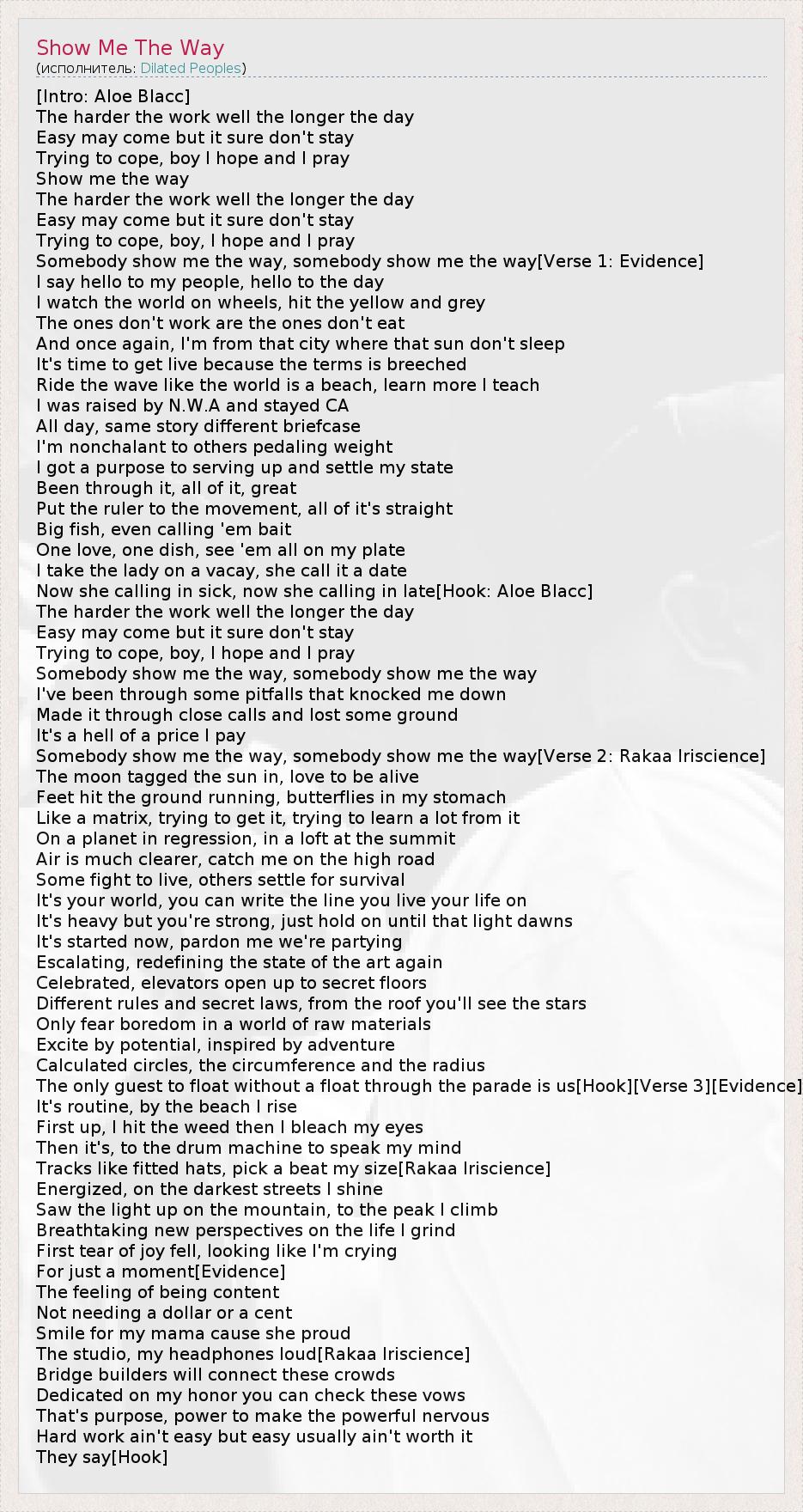 Somebody show me the way, somebody show me the way[Verse 2: Rakaa Iriscience]