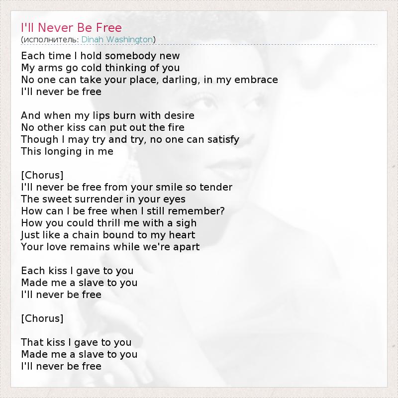 Each time I hold somebody new My arms go cold thinking of you No one can take your place, darling, in my embrace I'll never be free And when my lips burn with desire No other kiss can put out the fire Though I may try and try, no one can satisfy This longing in me [Chorus] I'll never be free from your smile so tender The sweet surrender in your eyes How can I be free when I still remember? How you could thrill me with a sigh Just like a chain bound to my heart Your love remains while we're apart Each kiss I gave to you Made me a slave to you I'll never be free [Chorus] That kiss I gave to you Made me a slave to you I'll never be free