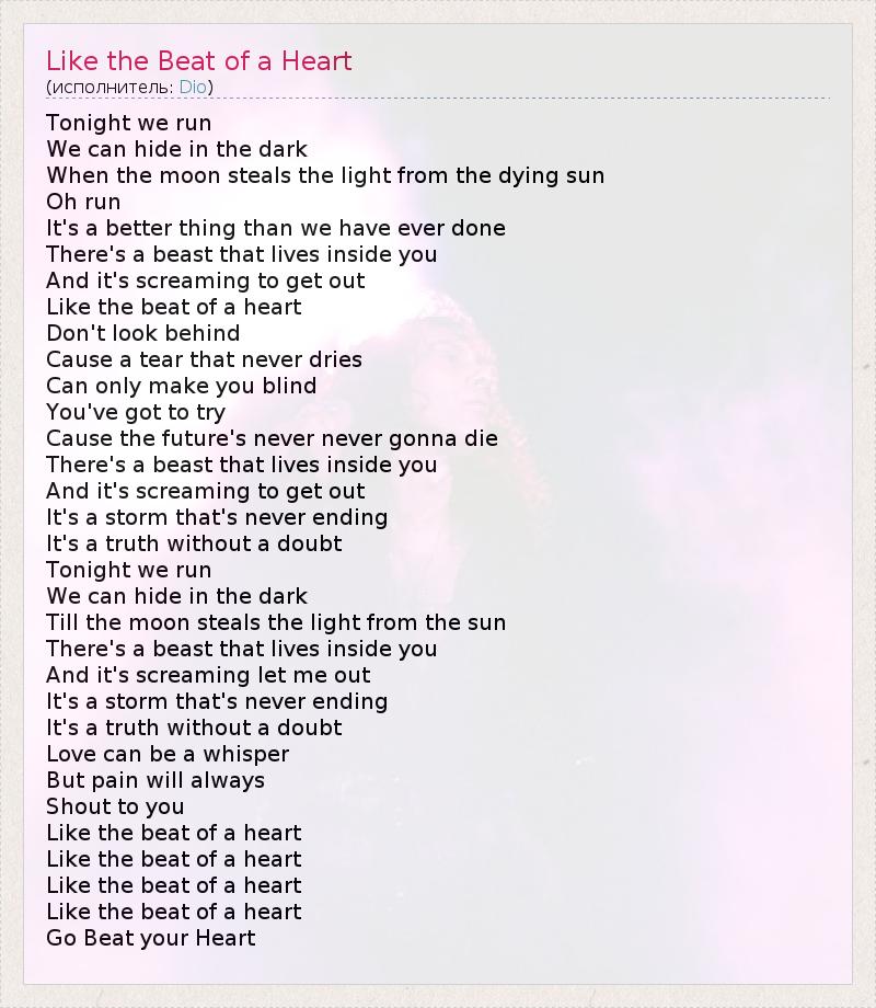 Tonight we run We can hide in the dark When the moon steals the light from the dying sun Oh run It's a better thing than we have ever done There's a beast that lives inside you And it's screaming to get out Like the beat of a heart Don't look behind Cause a tear that never dries Can only make you blind You've got to try Cause the future's never never gonna die There's a beast that lives inside you And it's screaming to get out It's a storm that's never ending It's a truth without a doubt Tonight we run We can hide in the dark Till the moon steals the light from the sun There's a beast that lives inside you And it's screaming let me out It's a storm that's never ending It's a truth without a doubt Love can be a whisper But pain will always Shout to you Like the beat of a heart Like the beat of a heart Like the beat of a heart Like the beat of a heart Go Beat your Heart