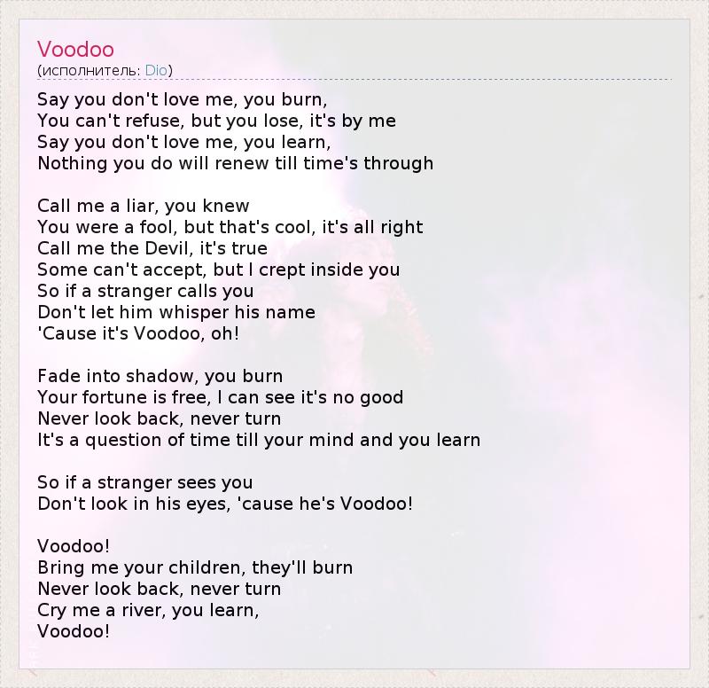 Say you don't love me, you burn, You can't refuse, but you lose, it's by me Say you don't love me, you learn, Nothing you do will renew till time's through Call me a liar, you knew You were a fool, but that's cool, it's all right Call me the Devil, it's true Some can't accept, but I crept inside you So if a stranger calls you Don't let him whisper his name 'Cause it's Voodoo, oh! Fade into shadow, you burn Your fortune is free, I can see it's no good Never look back, never turn It's a question of time till your mind and you learn So if a stranger sees you Don't look in his eyes, 'cause he's Voodoo! Voodoo! Bring me your children, they'll burn Never look back, never turn Cry me a river, you learn, Voodoo!