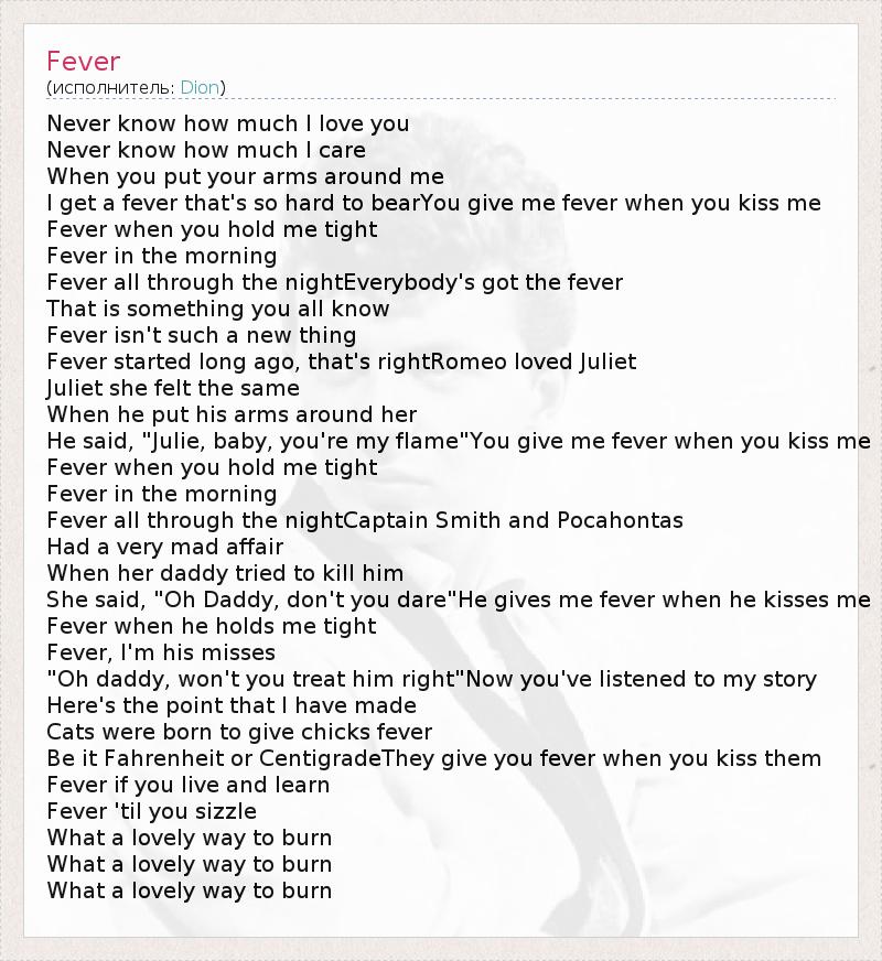 I get a fever that's so hard to bearYou give me fever when you kiss me