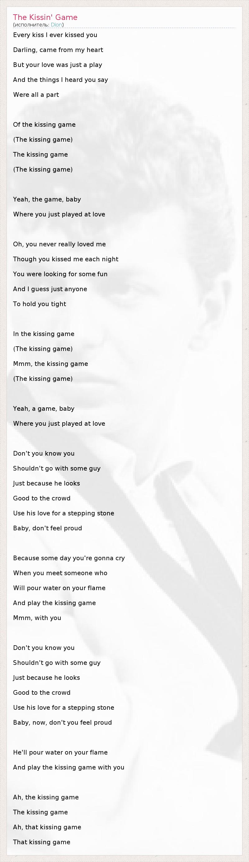 Every kiss I ever kissed you Darling, came from my heart But your love was just a play And the things I heard you say Were all a part Of the kissing game (The kissing game) The kissing game (The kissing game) Yeah, the game, baby Where you just played at love Oh, you never really loved me Though you kissed me each night You were looking for some fun And I guess just anyone To hold you tight In the kissing game (The kissing game) Mmm, the kissing game (The kissing game) Yeah, a game, baby Where you just played at love Don't you know you Shouldn't go with some guy Just because he looks Good to the crowd Use his love for a stepping stone Baby, don't feel proud Because some day you're gonna cry When you meet someone who Will pour water on your flame And play the kissing game Mmm, with you Don't you know you Shouldn't go with some guy Just because he looks Good to the crowd Use his love for a stepping stone Baby, now, don't you feel proud He'll pour water on your flame And play the kissing game with you Ah, the kissing game The kissing game Ah, that kissing game That kissing game